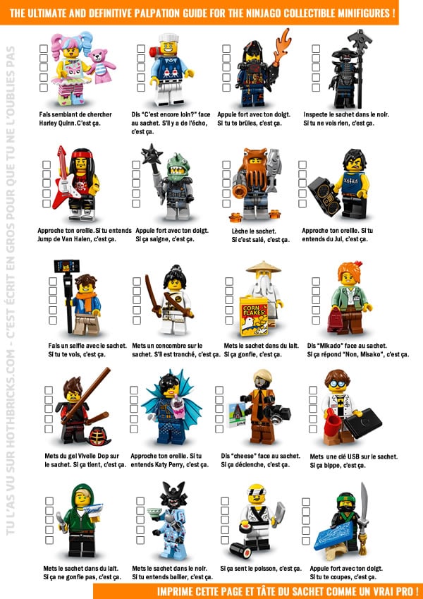 La série de minifigurines LEGO® NINJAGO® LE FILM™ va offrir de nouvelles possibilités de jeu grâce à des figurines incluant Kai Kendo, Nya s'entraînant au Spinjitzu, Lloyd, Jay Walker, Cole, Zane, Lloyd Garmadon, Maître Wu, le Chef Sushi, la Fille N-POP, GPL Tech, le bandit pieuvre de l'armée des requins, le bandit requin blanc, le Général en chef de l'armée des requins, le bandit pêcheur de l'armée des requins, Garmadon, Garmadon du Volcan, Garmadon du passé, Misako et le Rockeur qui joue de la guitare et du gong. Chaque figurine est vendue dans un sachet surprise avec un ou plusieurs accessoires, sa plaque d'exposition et son livret de collectionneur.